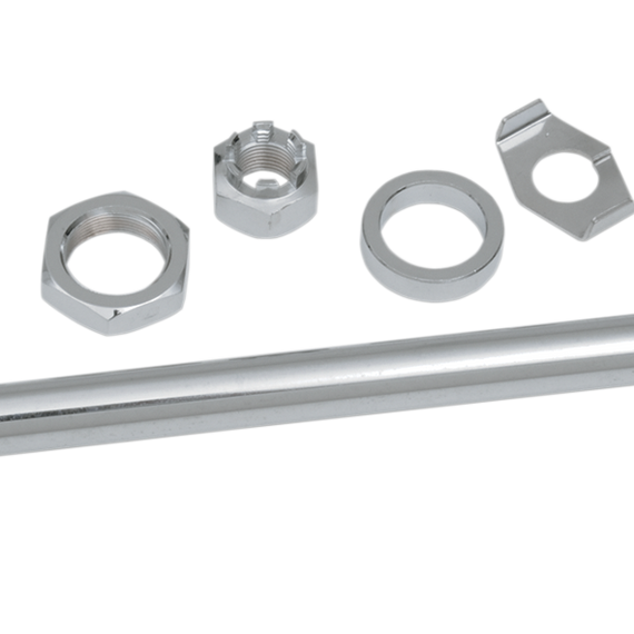 Caracteristicas: Bright chrome finish on axle and hardware beautifies your bike Kits include axle, spacers, nuts and washers Machined from chromoly steel Rear axle length given is measured from the inside of the bolt head to the end of the threads.