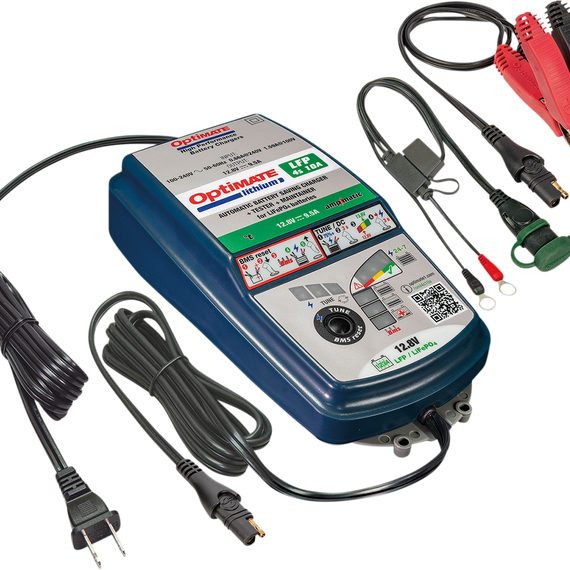 Caracteristicas: 10-step 12.8V 10A sealed battery saving charger and maintainer The fastest professional battery charger for 12.8V/13.2V (LiFePO4/LFP) performance/race batteries Includes a TUNE mode for diagnostics or updating programming Automatically and safely charges, tests and maintains LiFePO4/LFP or deep cycle batteries Ampmatic charge control adjusts current to match battery size and condition Low-volt start of 0.5V Pushbutton-activated BMS wakeup mode safely wakes battery out of sleep mode or low discharge Smart, 24/7 interactive maintenance prevents discharge from connected circuitry