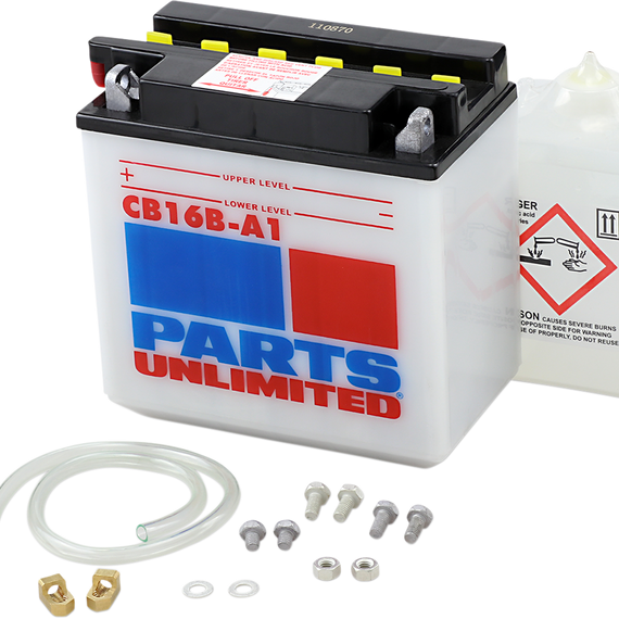• Kit includes battery, pre-measured acid pack, red filler tube, hardware kit and clear vent tube