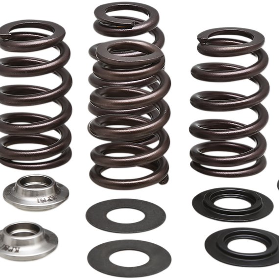 Caracteristicas: By taking advantage of the latest development in valve spring wire chemistry and manufacturing techniques, By coupling these developments with strict KPMI® design protocols and employing multiple design simulation and FEA analysis software, we were we able to overcome the torsional stresses unique to ovate wire springs that previously limited their operating parameters. KPMI® Beehive Springs are progressively wound using Kobe Super-Clean chrome silicon based wire that is heat treated and shot peened. KPMI® uses its tightly toleranced, FEA designed hardened Titanium retainers in these applications to ensure correct assembly height and resist keeper pull through. The hardened steel basewashers included in these kits are designed to locate the spring and control lateral movement. KPMI® has developed ovate wire Beehive style springs that will live and perform at a high level in Husqvarna® and KTM® applications.