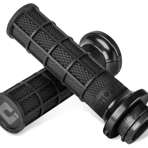 Caracteristicas: Moto-inspired grip system specifically designed for your performance V-Twin Medium-compound materials provide excellent durability and comfort Full-waffle moto-pattern reduces vibration/provides improved grip in all conditions Heavily knurled base-pattern delivers solid traction and control Billet-aluminum clutch-side clamp ensures 100% slip-free security (eliminates the need for set-screws) T15 Torx bolts ensure extra-secure clamping for solid, twist-free mounting Proudly made in the U.S.A.