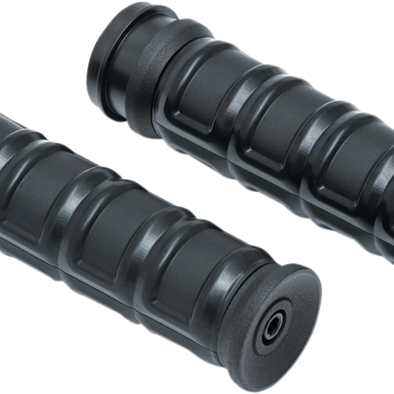 Caracteristicas: Dillinger Grips combine a narrow profile with ribbed EPDM rubber for aggressive grip, commanding control and a soft, vibration-dampening foundation to combat hand and forearm fatigue Durable ribbed EPDM rubber provides comfortable grip, vibration dampening, and will not hard, crack or wear over time Features aluminum collars and removable end caps for use/installation of bar-end mirrors, turn signals or weights