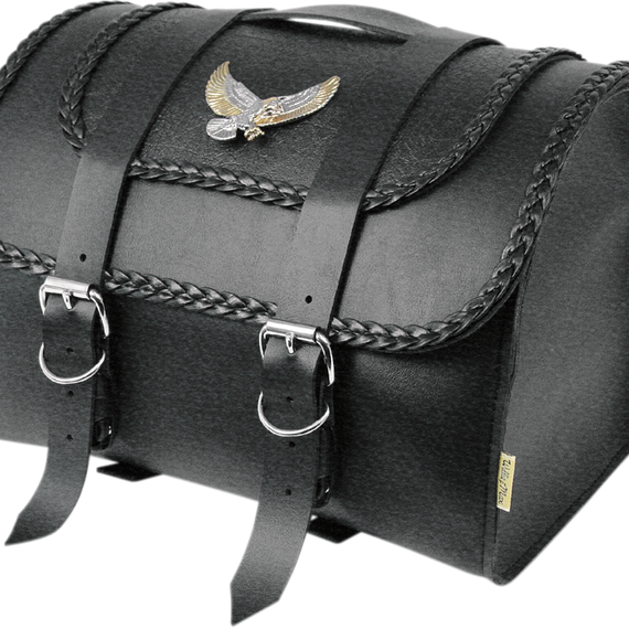 Caracteristicas: Black synthetic leather; same styling as the rest of the Black Magic collection Large main compartment with reinforced plastic and double-buckle closure Attaches to most sissy bars with easy-to-use 2" wide hook-and-loop straps Four lace points for securing to luggage rack; laces included 13" L x 10" W x 10" D Made in the U.S.A. The Max Pax must be supported by a fender luggage rack.