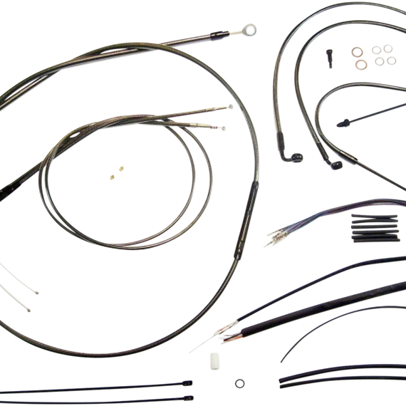 Caracteristicas: The only complete kits with matching braided cables and brake lines Kits include throttle and idle cables of throttle-by-wire extensions, clutch cable or hydraulic clutch line, brake lines, copper crush washers, hardware, and any necessary switch wiring of turn signal extension All cables are a low-effort, high-efficiency design that meets or exceeds all OE specifications for fitment, construction, endurance Kits for dual disc models include an all brazed manifold that eliminates leaks, alignment problems and unattractive threaded connections Assembled in the U.S.A. Kits are based on using ape hanger style handlebars with 2” risers