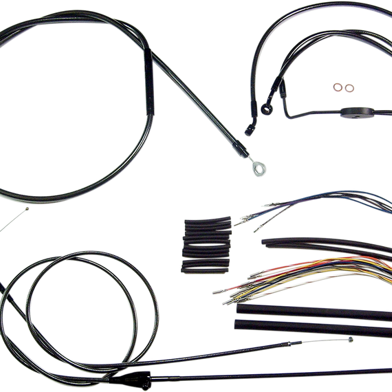 Caracteristicas: The only complete kits with matching braided cables and brake lines Kits include throttle and idle cables of throttle-by-wire extensions, clutch cable or hydraulic clutch line, brake lines, copper crush washers, hardware, and any necessary switch wiring of turn signal extension All cables are a low-effort, high-efficiency design that meets or exceeds all OE specifications for fitment, construction, endurance Kits for dual disc models include an all brazed manifold that eliminates leaks, alignment problems and unattractive threaded connections Assembled in the U.S.A. Kits are based on using ape hanger style handlebars with 2” risers