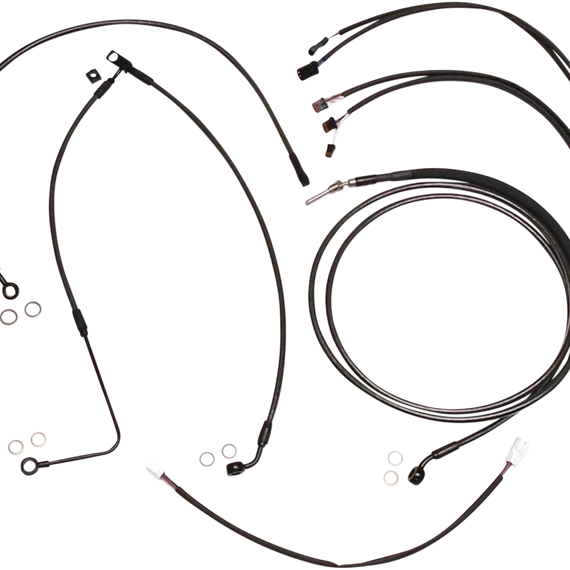 Caracteristicas: The only complete kits with matching braided cables and brake lines Kits include throttle and idle cables of throttle-by-wire extensions, clutch cable or hydraulic clutch line, brake lines, copper crush washers, hardware, and any necessary switch wiring of turn signal extension All cables are a low-effort, high-efficiency design that meets or exceeds all OE specifications for fitment, construction, endurance Kits for dual disc models include an all brazed manifold that eliminates leaks, alignment problems and unattractive threaded connections Assembled in the U.S.A. Kits are based on using ape hanger style handlebars with 2” risers