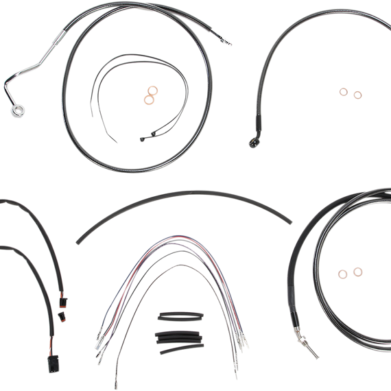 • Kits include throttle and idle cables of throttle-by-wire extensions, clutch cable or hydraulic clutch line, brake lines, copper crush washers, hardware, and any necessary switch wiring of turn signal extension
