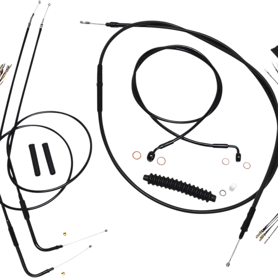 Caracteristicas: Magnum XR Handlebar Installation Kits offer a great fit and excellent quality at an economical price Kit features highly polished, chrome plated fittings All cables are a low effort, high efficiency design that meets or exceeds all OE specifications for fitment, construction, endurance Magnum XR Brake Lines use an enhanced construction of heavy gauge stainless steel embedded in tough abrasion resistant nylon outer jacket for superior durability and extreme braking response for safe riding The coating on cables and brake lines offers exceptional protection for paint or chrome Kits that include manifolds use an all brazed construction to ensure optimal OE fitment and appearance Manifolds use -3 AN connections for an easy installation Kits include throttle and idle cables or throttle-by-wire extensions, clutch cable or XR hydraulic clutch line, XR brake lines, copper crush washers, hardware, turn signal and switch wiring extensions Kits are based on using ape hanger style handlebars and 2" risers.