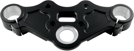 Caracteristicas: Allows the use of most handlebars and risers with a standard 3.5" on-center mounting Mounting holes for stock Blackline gauge mount Riser mounting holes are 3/4" further forward than standard top tree Billet aluminum with a flat black finish Made in the U.S.A.