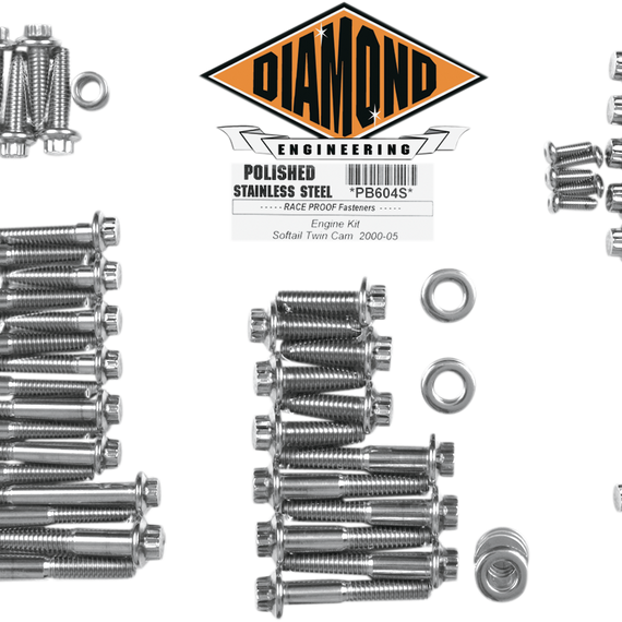 Caracteristicas: Hand-polished stainless steel engine kits are designed to provide a custom and detailed look with easy installation Five groups of fasteners will detail all your engine covers with a lasting shine Diamond Engineering's special hex flange rocker box bolts are included for Twin Cam models Includes fasteners for primary, inspections and inner primary; cam and points; oil pump or oil line cover, filter mount and sensors (Dyna and Touring models) or oil filter plugs and sensors (Softail Twin Cam); lifter blocks; and rocker boxes Made in the U.S.A.