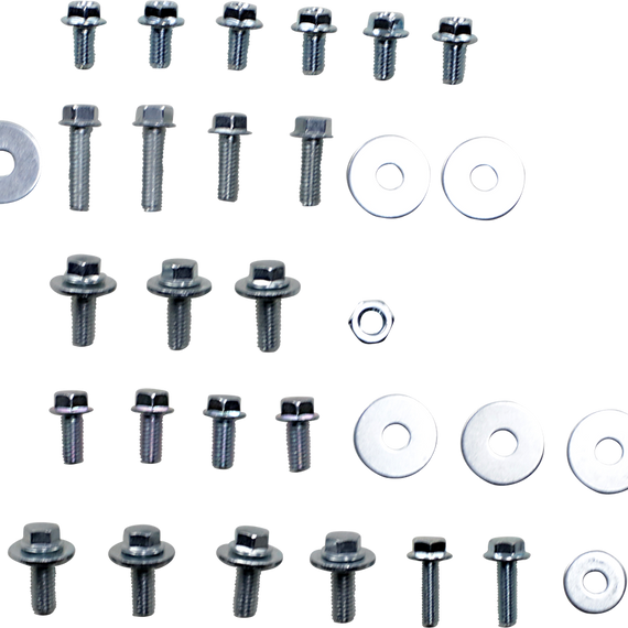 Caracteristicas: Bolt kits for body plastics designed specifically for Suzuki Includes bolts for front and rear fenders, fork guards, front number plates, seats, side panels and radiator shrouds