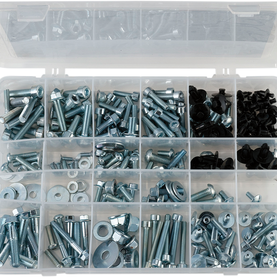 Caracteristicas: Includes hundreds of pieces developed to work with most ATVs Includes hex/Allen bolts and nuts of multiple lengths/sizes/types, flat washers, lock washers, and two sizes of plastic rivets for fenders The perfect kit to handle most repairs