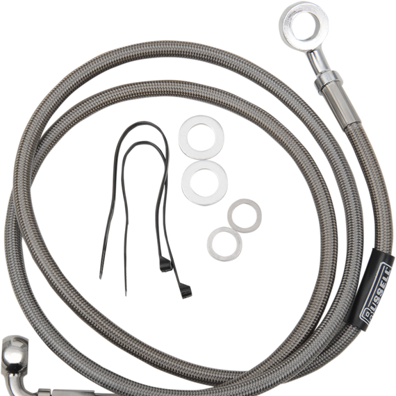 Caracteristicas: Using all stock mounting locations and hardware, simply route your hose and attach the banjo at the master cylinder The banjo is incorporated at the caliper end of the hose assembly Features Russell's exclusive 360° swivel banjo system Engineered using two O-rings for a positive seal All lines have a 3/8" 90° banjo at the caliper end Makes the rotation alignment hassle free