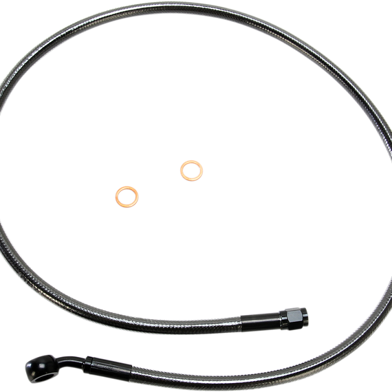 Caracteristicas: Manufactured with an enhanced construction designed to be compatible with Harley-Davidson ABS requirements for stock and alternate length brake lines - designed to follow the same routing path as OEM lines Brake kits consist of a direct fit lower assembly used in conjunction with alternative length upper lines Braid color and weave match all MAGNUM control cables and brake lines - Crystal clear outer jacket offers exceptional protection against scuffing paint or chrome and will never discolor Brake lines are constructed with PTFE inner tubing, DuPont™ Kevlar® aramid fiber, premium Signature Magnum braids and an outer PVC jacket to greatly reduce line expansion Upper, lower, mid brake line and adapter kits are sold separately to for a perfect fit. Compliant with all DOT FMVSS-106 requirements Assembled in the U.S.A. DuPont™ and Kevlar® are trademarks or registered trademarks of E.I. du Pont de Nemours and Company. Single disc Dyna and Sportster models use two kits – one upper and one lower. Softail models utilize 3 kits (except '18+ dual disc), with the lower being optional on all. Upper kits are required for handlebar changes; by using either an upper brake line adapter or for '11 - '17 Softail models, the optional ABS Lower Brake Line Kit which includes the adapter. Adapter for Softail models allows the upper brake line to complete the connection from the ABS controller ('11 - '17) or lower brake line ('18+) to the master cylinder If replacing the stock lower brake line assembly on '18+ dual disc Softails, an adapter is NOT needed. Using AN-3 fittings, the upper line connects directly to the Magnum lower assembly Dual disc Touring models use three kits - one upper, one lower and one mid-line. Trike models use two kits - one upper and one mid-line. No lower is available. A Designer mid-line and upper line is required for all Touring and Trike models with ABS. The mid-line connects to the upper brake line in the fairing or nacelle and completes the routing from the master cylinder to the ABS controller. A lower kit is optional. Non-stock applications require taking a measurement for upper brake line length and banjo angle to ensure correct fitment (see How to Order) Harley-Davidson motorcycles equipped with ABS (anti-lock brake system) require ABS specific upper and lower brake line kits. Failure to do so may result in compromised anti-lock braking ability. Magnum Shielding upper brake line kits manufactured specifically for these applications are identified with the letters “ABS” printed directly on the brake hose. Upper line length for Softail, Dyna, and '14+ Sportster models is determined by using your stock OE master cylinder brake line as a guide. Pull the rubber boot back and measure from the point at which the soft, flexible line enters the crimp collar on the lower portion. Follow the brake line routing up to your master cylinder. (see diagrams below) '18+ Softail – Upper line replacement when reusing the stock lower brake line. (adapter required) Lengths are determined by using the stock master cylinder line for a guide. Measure from the lower brake line manifold where the upper line attaches, up to the master cylinder. From that measurement subtract 1.5” for the adapter and round up to the next number to determine upper line length. (see diagram below) '18+ Softail Single Disc Upper and Lower line replacement requires an adapter. (3 kits) Adapter is NOT needed when replacing both the Upper and Lower '18+ Softail Dual Disc brake lines. (2 Kits) The upper line connects directly to the Magnum Designer dual disc lower brake line. Follow the above instruction without subtracting 1.5” for the adapter. Rounded up, the length measured will be correct. Upper line length for Touring and Trike models is measured using the 49" mid-line as a reference to determine additional line length needed to complete the routing from the ABS controller to the master cylinder. That measurement will be your upper line length.