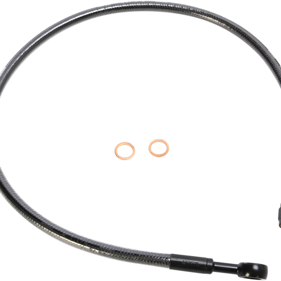 Caracteristicas: Manufactured with an enhanced construction designed to be compatible with Harley-Davidson ABS requirements for stock and alternate length brake lines - designed to follow the same routing path as OEM lines Brake kits consist of a direct fit lower assembly used in conjunction with alternative length upper lines Braid color and weave match all MAGNUM control cables and brake lines - Crystal clear outer jacket offers exceptional protection against scuffing paint or chrome and will never discolor Brake lines are constructed with PTFE inner tubing, DuPont™ Kevlar® aramid fiber, premium Signature Magnum braids and an outer PVC jacket to greatly reduce line expansion Upper, lower, mid brake line and adapter kits are sold separately to for a perfect fit. Compliant with all DOT FMVSS-106 requirements Assembled in the U.S.A. DuPont™ and Kevlar® are trademarks or registered trademarks of E.I. du Pont de Nemours and Company. Single disc Dyna and Sportster models use two kits – one upper and one lower. Softail models utilize 3 kits (except '18+ dual disc), with the lower being optional on all. Upper kits are required for handlebar changes; by using either an upper brake line adapter or for '11 - '17 Softail models, the optional ABS Lower Brake Line Kit which includes the adapter. Adapter for Softail models allows the upper brake line to complete the connection from the ABS controller ('11 - '17) or lower brake line ('18+) to the master cylinder If replacing the stock lower brake line assembly on '18+ dual disc Softails, an adapter is NOT needed. Using AN-3 fittings, the upper line connects directly to the Magnum lower assembly Dual disc Touring models use three kits - one upper, one lower and one mid-line. Trike models use two kits - one upper and one mid-line. No lower is available. A Designer mid-line and upper line is required for all Touring and Trike models with ABS. The mid-line connects to the upper brake line in the fairing or nacelle and completes the routing from the master cylinder to the ABS controller. A lower kit is optional. Non-stock applications require taking a measurement for upper brake line length and banjo angle to ensure correct fitment (see How to Order) Harley-Davidson motorcycles equipped with ABS (anti-lock brake system) require ABS specific upper and lower brake line kits. Failure to do so may result in compromised anti-lock braking ability. Magnum Shielding upper brake line kits manufactured specifically for these applications are identified with the letters “ABS” printed directly on the brake hose. Upper line length for Softail, Dyna, and '14+ Sportster models is determined by using your stock OE master cylinder brake line as a guide. Pull the rubber boot back and measure from the point at which the soft, flexible line enters the crimp collar on the lower portion. Follow the brake line routing up to your master cylinder. (see diagrams below) '18+ Softail – Upper line replacement when reusing the stock lower brake line. (adapter required) Lengths are determined by using the stock master cylinder line for a guide. Measure from the lower brake line manifold where the upper line attaches, up to the master cylinder. From that measurement subtract 1.5” for the adapter and round up to the next number to determine upper line length. (see diagram below) '18+ Softail Single Disc Upper and Lower line replacement requires an adapter. (3 kits) Adapter is NOT needed when replacing both the Upper and Lower '18+ Softail Dual Disc brake lines. (2 Kits) The upper line connects directly to the Magnum Designer dual disc lower brake line. Follow the above instruction without subtracting 1.5” for the adapter. Rounded up, the length measured will be correct. Upper line length for Touring and Trike models is measured using the 49" mid-line as a reference to determine additional line length needed to complete the routing from the ABS controller to the master cylinder. That measurement will be your upper line length.