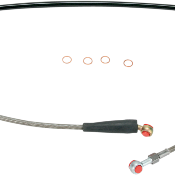 Caracteristicas: Swivel union ends are the secret to easier fitting, and ensure a kink- and stress-free installation Venhill Engineering in the UK makes Moose Racing Stainless Steel Brake and Clutch lines to the highest specifications Each line is made from top quality DuPont Teflon®-coated hose, wrapped with British-made stainless steel, and PVC-coated for protection and great looks Rubber protection boots and extra-rigid tubing are used to protect vulnerable areas from heat and impact and to prevent hose flex under compression Each line is designed to withstand a minimum of 14,000 psi Installing Moose Racing stainless lines gives a large performance increase by significantly reducing expansion under pressure and absorption of water when compared to stock rubber hoses