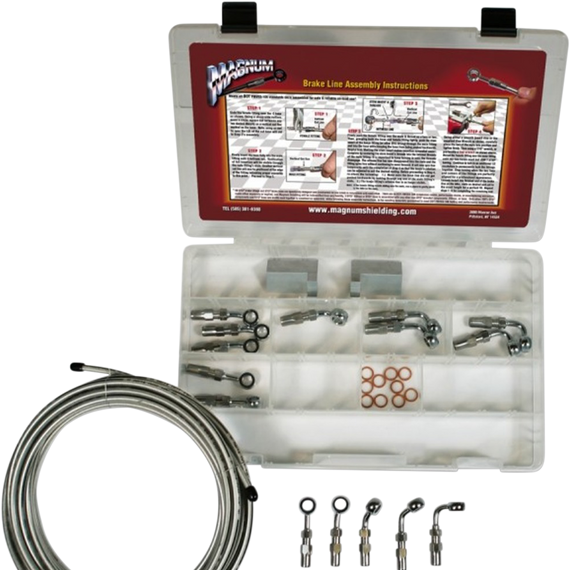 Caracteristicas: Organized in a labeled, compartmental carrying case and including (1) 3/8"/10 mm 180° Banjo fitting, (1) 3/8"/10 mm 35° Banjo fitting, (2) 3/8"/10 mm 60° Banjo fitting, (4) 3/8"/10 mm 90° Banjo fitting, (2) 7/16" 180° Banjo fitting, (3) 7/16" 35° Banjo fitting, (2) 7/16" 90° Banjo fitting, (20) 3/8"/10 mm Copper crush washers, (20) 7/16" Copper crush washers, (1) 25' brake cable with vinyl coating and (2) Aluminum BYO® Vise Jaws Assemble lines in only 5 minutes with side cutters and a 7/16” wrench for a perfect fit and alignment every time Brake hose and fittings are compliance labeled, pressure tested and 100% inspected NOT for use with Anti-lock Brake Systems