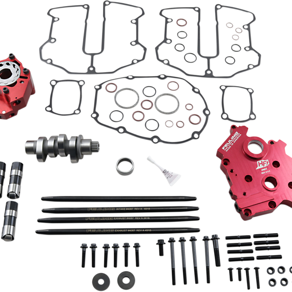 Caracteristicas: Kit includes Race Series oiling system: billet 7075 oil pump, Race Series lifters and High Flow billet aluminum camplate Oil pump is 50% harder and stronger than the factory pump, holds tighter tolerances under temperature Race Series hydraulic lifters have a full .200” of total travel designed with slower bleed-down rate to handle heavy valve spring pressures, increase engine rpm before valve float and feature increased roller clearance for steep-ramped camshafts and clearance for the M-Eight front exhaust camshaft lobe flange Quieter and smoother engine operation Increase oil pressure, scavenge volume and engine oil flow 15-25 degree cooler engine temperatures 15-30 degree cooler oil temperatures 10-30 more PSI of oil pressure Eliminate wet sumping, blow by and oily air cleaners Heavy duty .165” wall one-piece pushrods reduce valvetrain harmonics and increase valve lift High-flow air cleaner and triple-stepped exhaust pipe highly recommended High-lift high-load valve springs are required RPM range 2850-6250