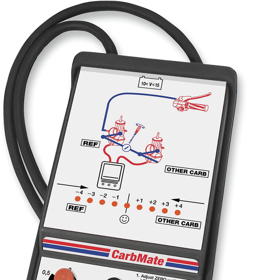 Caracteristicas: CarbMate displays the difference in vacuum intake settings of two carburetors or throttle bodies very precisely on a single transverse "East-West" 9 LED display - visual estimation errors, common to the traditional approach which is to visually compare the individual values on separate columns of mercury or dial gauges are eliminated as two pressures are compared and one value is displayed Electronic two-channel synchronizer for carburetors and fuel injection The cost-effective electronic replacement for mercury sticks Easily converted to synchronize three or four carburetors/throttle bodies (accessory sold separately) Bright color LED graph display reacts to even minor adjustments quickly Precision instrument that is accurate to 0.5cmHg (meets or exceeds OEM specifications) Solid-state electronics are shock resistant and extremely durable A single green LED at the center mark indicates that the compared manifold vacuums are perfectly equal to within the selected resolution A ZERO adjustment knob provides easy and quick pre-calibration prior to synchronizing; with no tubes connected, simply adjust the knob until the center LED is on Instrument powered by any 12V battery source (cord with clips supplied)