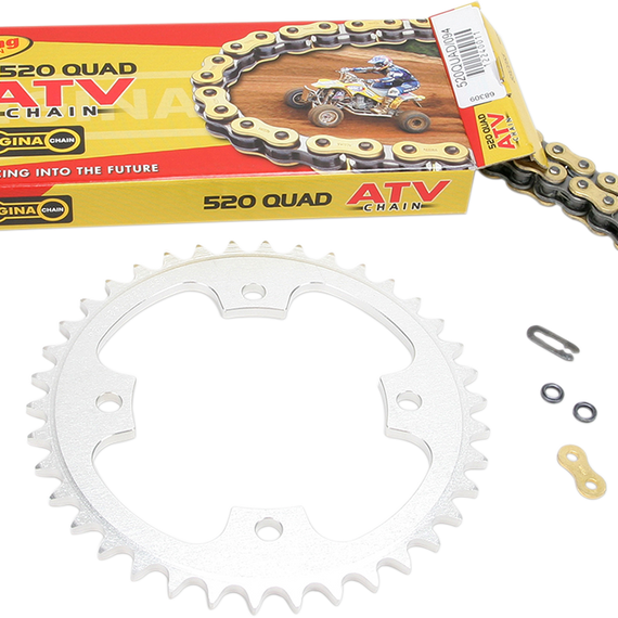 • Chain is Regina’s high-performance 520 Quad Z-ring series (8,000 ft./lb. strength) with gold outer plates and Z sealing rings, which dramatically improve performance and wear life; includes clip-type masterlink