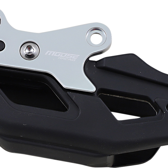 Caracteristicas: Main chain guide body is made from 6061 T6 Aluminum for added strength and durability Chain block is made from high density TPU materials for guaranteed high wear abrasion and impact resistance High quality anodization to prevent fade when exposed in high UV climates 3D Design helps prevent mud and debris from building up and causing chain derailment Mounting hardware is included