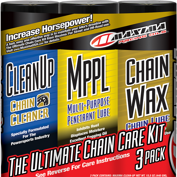 Caracteristicas: Kit includes: one 15.5-ounce aerosol can of Clean-Up, one 14.5-ounce aerosol can of MPPL, and one 13.5-ounce can of Chain Wax Clean-Up, MPPL (Multi-Purpose Penetrant Lube) and Chain Wax - a winning combination proven to increase horsepower and extend chain and sprocket life Clean-Up degreaser is excellent for chains and/or sprockets and easily washes out with water MPPL is a superior, all-purpose spray-on penetrating lubricant that provides a barrier against rust and corrosion; great for displacing moisture Chain Wax's parafilm formula sprays on as a liquid, penetrates and then sets up as a soft waxy film to create an excellent lube that protects chain from the elements; resists fling-off For street and off-road use