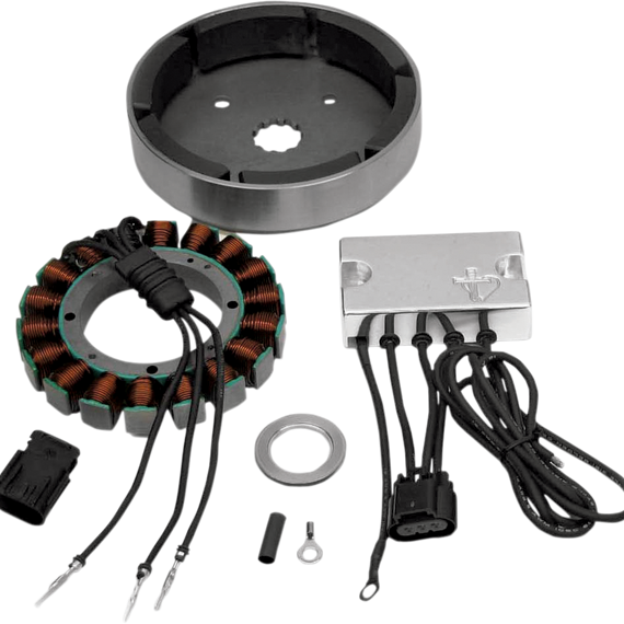 Caracteristicas: 32A narrow rotor design converts an original single-phase system to a three-phase system on Evolution or S&S Evolution motors Digitally calibrated for optimum charging level over a wide temperature range Rugged billet aluminum regulator housing is highly polished for a custom look Self-temperature compensated to control heat and extend service life; over-temperature protection prevents catastrophic heat failure under severe operating conditions System reaches full charge at 550 to 650 rpm; factory system reaches full charge at 1000 rpm Designed for custom applications Not for fuel-injected models.