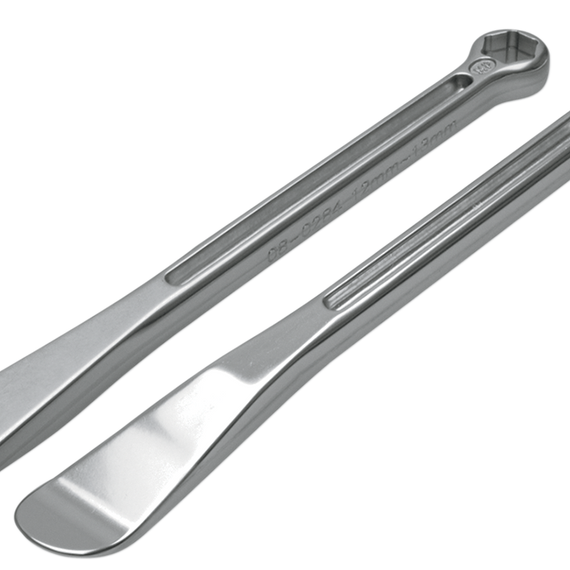 • Perfectly contoured tire lever on one end and a unique combination stepped 12 mm - 13 mm box end wrench on other end for turning rim lock nuts or a hex box wrench sized for axle nuts on other end