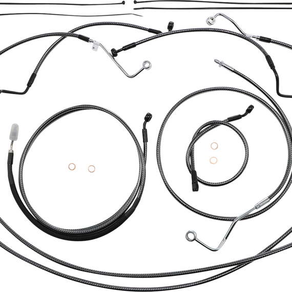 Caracteristicas: KARBONFIBR wire braid is created from distinct black and gray tone wire colors which are blended and interwoven together to mimic the look of hi-tech carbon fiber. This unique alternative black braid highly complements black or blackout color scheme motorcycles Kits include – Premium DOT brake lines, clutch cable or hydraulic clutch line, throttle and idle cables or throttle-by-wire extensions, hardware, and fully terminated or plug-and-play switch and turn signal extensions Matching KARBONFIBR braided hydraulic lines and control cables provide a precise, OE fit KARBONFIBR high-efficiency cables feature anti-friction liners and inserts, durable clear coating, are factory lubricated for smooth, long-lasting operation, plus they meet or exceed OE specifications Clutch cables include a water-proof adjuster and a transmission fitting seal to eliminate oil leaks Premium KARBONFIBR DOT brake lines incorporate PTFE tubing braided with DuPontTM Kevlar® Aramid Fiber reinforcement, Signature braid, and a clear PVC jacket Every Magnum brake line is pressure tested and fully FMVSS-106 compliant