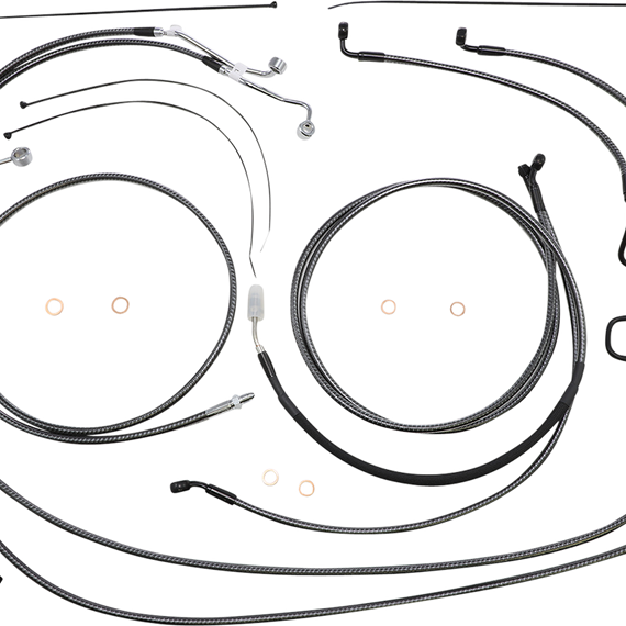 Caracteristicas: KARBONFIBR wire braid is created from distinct black and gray tone wire colors which are blended and interwoven together to mimic the look of hi-tech carbon fiber. This unique alternative black braid highly complements black or blackout color scheme motorcycles Kits include – Premium DOT brake lines, clutch cable or hydraulic clutch line, throttle and idle cables or throttle-by-wire extensions, hardware, and fully terminated or plug-and-play switch and turn signal extensions Matching KARBONFIBR braided hydraulic lines and control cables provide a precise, OE fit KARBONFIBR high-efficiency cables feature anti-friction liners and inserts, durable clear coating, are factory lubricated for smooth, long-lasting operation, plus they meet or exceed OE specifications Clutch cables include a water-proof adjuster and a transmission fitting seal to eliminate oil leaks Premium KARBONFIBR DOT brake lines incorporate PTFE tubing braided with DuPontTM Kevlar® Aramid Fiber reinforcement, Signature braid, and a clear PVC jacket Every Magnum brake line is pressure tested and fully FMVSS-106 compliant