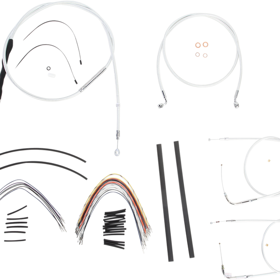 Caracteristicas: Complete kits with matching braided cables and brake lines Kits include throttle and idle cables of throttle-by-wire extensions, clutch cable or hydraulic clutch line, brake lines, copper crush washers, hardware, and any necessary switch wiring of turn signal extension All cable and brake lines feature Sterling Chromite II braid with highly polished chrome plated fittings All cables are a low-effort, high-efficiency design that meets or exceeds all OE specifications for fitment, construction and endurance Kits for dual disc models include an all brazed manifold that eliminates leaks, alignment problems and unattractive threaded connections Assembled in the U.S.A. Kits are based on using ape hanger style handlebars with 2” risers