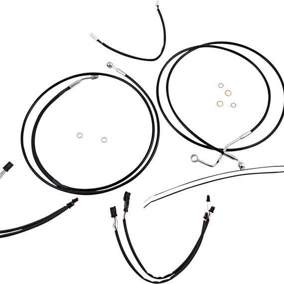 Caracteristicas: Magnum XR Handlebar Installation Kits offer a great fit and excellent quality at an economical price Kit features highly polished, chrome plated fittings All cables are a low effort, high efficiency design that meets or exceeds all OE specifications for fitment, construction, endurance Magnum XR Brake Lines use an enhanced construction of heavy gauge stainless steel embedded in tough abrasion resistant nylon outer jacket for superior durability and extreme braking response for safe riding The coating on cables and brake lines offers exceptional protection for paint or chrome Kits that include manifolds use an all brazed construction to ensure optimal OE fitment and appearance Manifolds use -3 AN connections for an easy installation Kits include throttle and idle cables or throttle-by-wire extensions, clutch cable or XR hydraulic clutch line, XR brake lines, copper crush washers, hardware, turn signal and switch wiring extensions Kits are based on using ape hanger style handlebars and 2" risers.