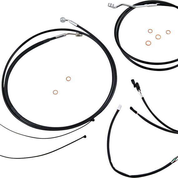 Caracteristicas: Magnum XR Handlebar Installation Kits offer a great fit and excellent quality at an economical price Kit features highly polished, chrome plated fittings All cables are a low effort, high efficiency design that meets or exceeds all OE specifications for fitment, construction, endurance Magnum XR Brake Lines use an enhanced construction of heavy gauge stainless steel embedded in tough abrasion resistant nylon outer jacket for superior durability and extreme braking response for safe riding The coating on cables and brake lines offers exceptional protection for paint or chrome Kits that include manifolds use an all brazed construction to ensure optimal OE fitment and appearance Manifolds use -3 AN connections for an easy installation Kits include throttle and idle cables or throttle-by-wire extensions, clutch cable or XR hydraulic clutch line, XR brake lines, copper crush washers, hardware, turn signal and switch wiring extensions Kits are based on using ape hanger style handlebars and 2" risers.