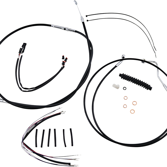 Caracteristicas: Magnum XR Handlebar Installation Kits offer a great fit and excellent quality at an economical price Kit features highly polished, chrome plated fittings All cables are a low effort, high efficiency design that meets or exceeds all OE specifications for fitment, construction, endurance Magnum XR Brake Lines use an enhanced construction of heavy gauge stainless steel embedded in tough abrasion resistant nylon outer jacket for superior durability and extreme braking response for safe riding The coating on cables and brake lines offers exceptional protection for paint or chrome Kits that include manifolds use an all brazed construction to ensure optimal OE fitment and appearance Manifolds use -3 AN connections for an easy installation Kits include throttle and idle cables or throttle-by-wire extensions, clutch cable or XR hydraulic clutch line, XR brake lines, copper crush washers, hardware, turn signal and switch wiring extensions Kits are based on using ape hanger style handlebars and 2" risers.