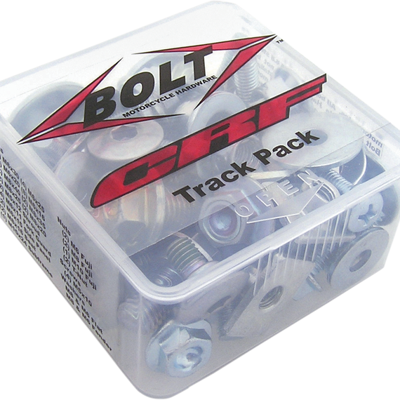 Caracteristicas: Designed for full-size CRF models The only aftermarket hardware in Honda factory style and finish, this extensively researched 56-piece Track Pack contains sub-frame bolts, fork guard bolts, radiator shroud bolts, M5, M6 and M8 hex flange bolts, T-nuts, Fuji-nuts and more