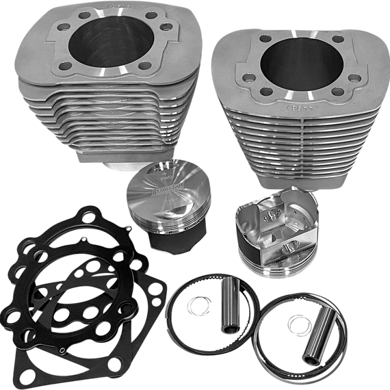 Caracteristicas: Revolution™ aerospace-grade all-aluminum cylinders with nickel-silicon-carbide electroplated bores, which means NO SLEEVING; allows larger bore sizes and less friction for more horsepower, lower temps, and a longer lifespan True bolt-on kit that delivers major power with no machine work required Also includes Wiseco forged pistons with rings (that are specifically designed for optimal compatibility with Revolution Performance's cylinders), wrist pins, circlips and high-performance head and base gaskets Replacement head and base gasket sets available separately Made in the U.S.A. For replacement pistons and rings, see Revolution Performance Big Bore Piston Kits.