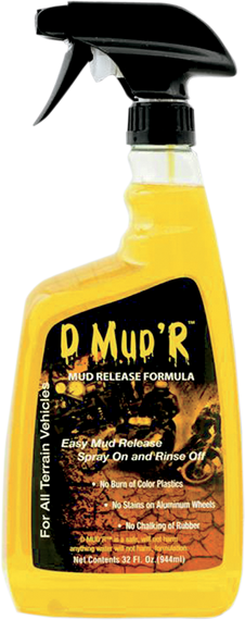 Caracteristicas: D Mud'R is formulated for all vehicles: motorcycles, ATVs, snowmobiles, watercraft, jeeps, trucks and other off-road vehicles No burning of color-molded plastics or stains on aluminum wheels Cleans without chalking color-molded plastic parts or rubber parts Easy mud release for shocks, springs, struts and all suspension parts Safe for use on clear-coated, highly polished, painted or brushed aluminum wheels and components D Mud'R is as safe as water Made in the U.S.A.