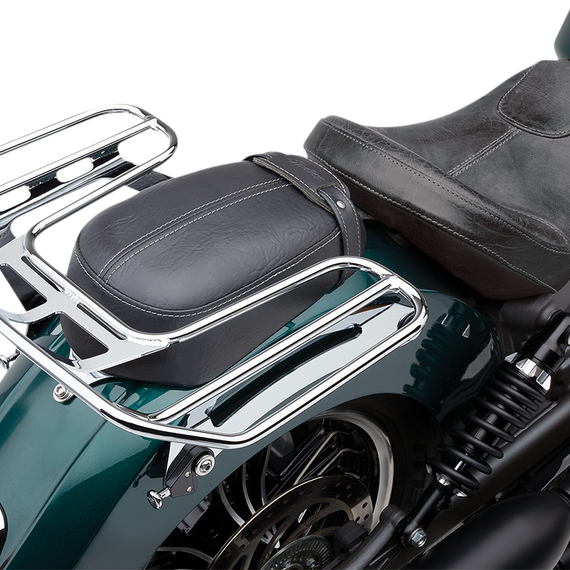 Caracteristicas: The top of the rack is about level with the top of the seat and each rack has a kick up in the rear There are places to attach bungee cords or mounting straps so you no longer have to scratch your bike’s fender as you secure your cargo If you are using an aftermarket seat other than the Saddlemen or Lucky Daves step ups, then look carefully at the measurements of the opening to ensure the rack will fit around your bike’s seat They do not work with nor require the Harley-Davidson mounting kits. Mounting hardware included Made in the U.S.A.