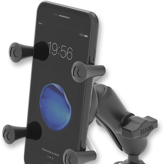 Caracteristicas: Features a B-sized 1" rubber ball mounting base that accommodates handlebars 3/4" - 1" in diameter paired with the dynamic X-Grip® for phones Sizing inserts included to provide a snug fit and offer additional protection for the rail Low-profile mount utilizes nylon-insert locknuts to secure personal electronics and small accessories to prevent loosening in high-vibration environments Included spring-loaded, X-Grip® cradle has a clean and clever four-leg design that provides great holding power without hiding your phone; X-Grip® cradle expands and contracts, allowing for a perfect custom fit X-Grip® also includes a device tether recommended for outdoor applications Cradle is compatible with handheld devices that will fit the following dimensions: minimum width of 1.875" with a minimum height of 4.25"; maximum width of 3.25" with a minimum height of 2.25"; depth of 0.875" It is important to verify the dimensions of your handheld device with a case/sleeve/skin when determining the overall size.