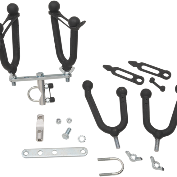 Caracteristicas: Carries everything from guns to garden tools Easy installation and removal Fits all handlebars and tubular racks Rubber snubbers included Skin-packed on display card Replacement mount blocks let you switch snubbers from handlebars to front or rear racks
