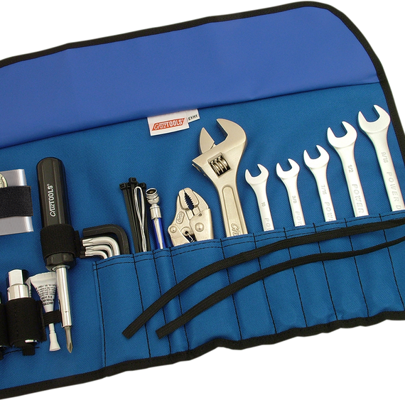 • Contains 3/8", 7/16", 1/2", 9/16", and 10 mm wrenches, 1/8",5/32", 3/16", 1/4" and 5/16" hex wrenches, T25, T27, and T40 star wrenches, 6-in-1 screwdriver, 5/8" (16 mm) and 3/16" spark plug sockets, 8" adjustable wrench, locking pliers, spark plug gap gauge, duct tape, cable tires (5-pack), mechanic's wire, threadlocker, and a tire pressure gauge