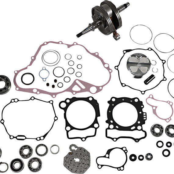 Caracteristicas: Complete engine rebuild kit Includes crankshaft, piston kit, complete engine gasket kit with oil seals, main bearings and seals, water pump rebuild kit, transmission bearings, countershaft bushing/seal kit, wrist pin bearing, cam chain and counter balancer bearings when applicable