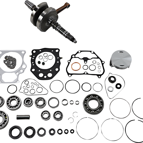 Caracteristicas: Complete engine rebuild kit Includes crankshaft, piston kit, complete engine gasket kit with oil seals, main bearings and seals, water pump rebuild kit, transmission bearings, countershaft bushing/seal kit, wrist pin bearing, cam chain and counter balancer bearings when applicable