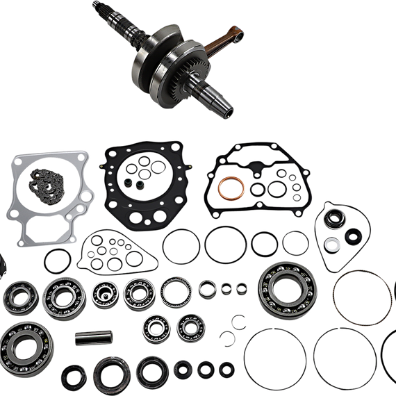 Caracteristicas: Complete engine rebuild kit Includes crankshaft, piston kit, complete engine gasket kit with oil seals, main bearings and seals, water pump rebuild kit, transmission bearings, countershaft bushing/seal kit, wrist pin bearing, cam chain and counter balancer bearings when applicable