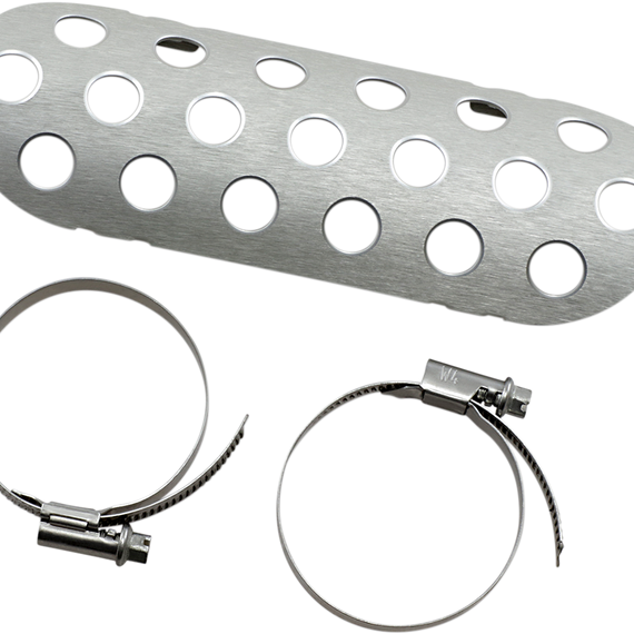 Caracteristicas: Protect boots from hot mid-pipes Constructed of anodized aluminum to add a high-performance trick look 7" long for excellent coverage Recessed edge lightening holes to eliminate sharp edges Eliminate scuff and burn marks on pipe Fit 2" - 2-5/8" mid-pipe diameter Exhaust clamps included; easy to install