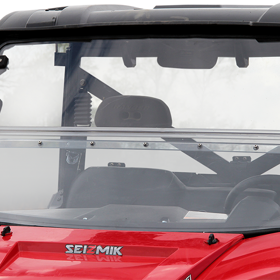 Caracteristicas: The best and only folding windshield design with a full perimeter seal design (No-Gap between windshield and roof); seals as good as any full windshield Automotive-grade high-deflection bulb gasket around entire windshield perimeter insures best in class seal Top folds against the bottom, nothing contacts the hood Quickly release/secure upper windshield section with simple twist of 2 composite levers; no tools required Top windshield held in folded position securely and easily with 2 heavy-duty captive rubber plugs Mechanically attached UV protected transparent hinge is durable and replaceable Works with Polaris OEM roof and doors Works with SEIZMIK Pre-Runner Light Bar System, Mirror Kits, Doors and Hood Rack Trailerable to 65 mph when ‘folded down’ Hood Rack needs to be unlatched and tilted forward to allow upper windshield to fold down, then replaced once upper windshield is secure.