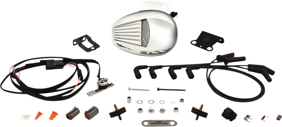 Caracteristicas: The new Milwaukee Eight Softail motorcycles utilize the center motor mount location to mount the coil. In order to install a JIMS Forceflow on these motorcycles, it was necessary to re-locate the coil. JIMS has developed a turnkey coil relocation system to move the coil to the front of the motorcycle inconspicuously tucked underneath the neck of the bike, in-between the frame tubes. This new mounting system allows the JIMS Forceflow to be installed on all Milwaukee Eight Softail motorcycles. This proven cooling system drops your cylinder head temperature by as much as 100 degrees. The cooling fan can be controlled manually or it can be regulated by a thermostat that monitors head temperature and activates the fan when engine temperature rises. This kit is highly recommended for performance motors to help extend engine life. This complete bolt in kit includes the high powered fan, housing with incorporated horn, thermostat, coil relocation kit with plug wires, all necessary hardware, wiring, and detailed instructions.