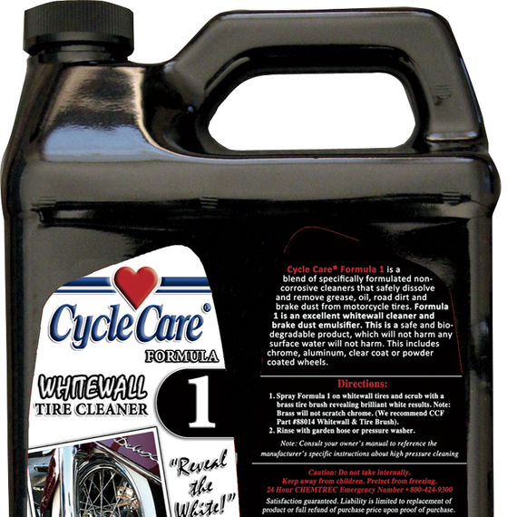 Caracteristicas: Specifically formulated non-corrosive cleaners that safely dissolve brake dust, road grime, tar, grease, etc. from tires and wheels (agitation required in extremely neglected situations) Cleans but will not dull powder-coated engines A safe and biodegradable product; just as safe as water on a variety of surfaces such as chrome and aluminum, clear or powder-coated wheels Spray on whitewall tires and scrub with a tire brush for brilliant white results Made in the U.S.A.