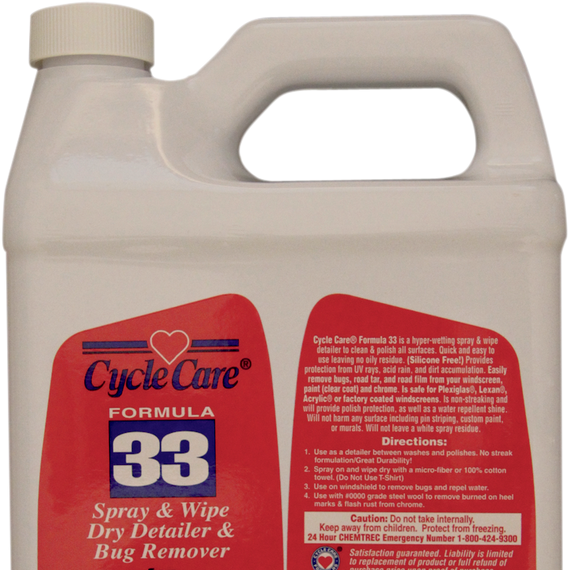 • Cycle Care® Formula 33 for Windshields, Paint & Chrome, a hyper-wetting spray, to clean and polish all surfaces