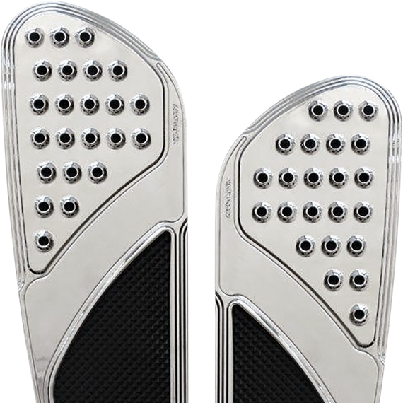 Caracteristicas: Replace the stock OEM front floorboards for a more custom look Extended 63.5 mm (2-1/2") in the front, and 19 mm (3/4") wider and 25.4 mm (1") longer in the rear Mounts like stock with stock hardware Machined with 6061 T-6 billet aluminum The top portion of the board has a raised hole feature inspired by racing pedals The lower area is a multi-directional, slip-resistant Machined Pyramid-Top Knurled design